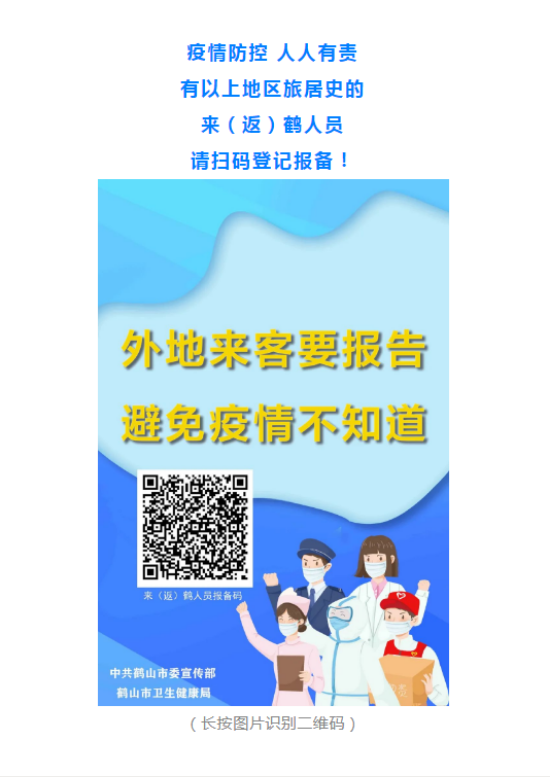 一、主动报备行程。近期各地来(返)鹤人员密切关注“鹤山政府网”、“鹤山发布”等公众号的疫情防控有关通告,涉疫地区来返鹤人员及时向所在镇街报备,并积极配合落实健康管理各项防控措施。