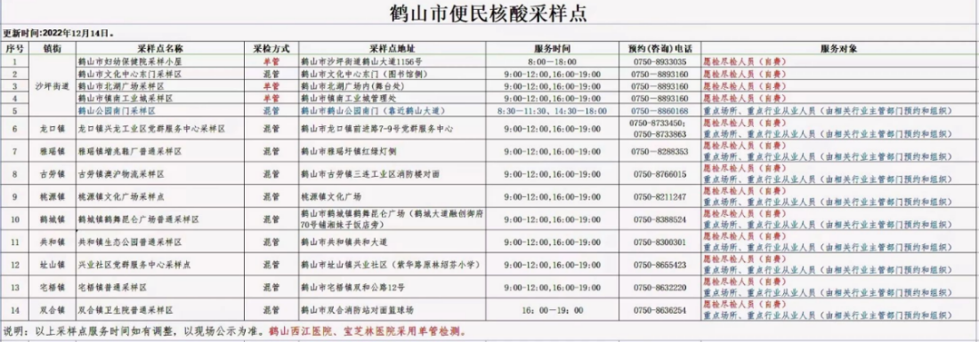 为进一步优化我市便民核酸采样检测服务工作,减少混管采样对群众正常生活的干扰,从12月14日起,我市部分便民核酸采样点仅提供单管采样服务,请广大市民根据自身需要选择相应的采样点进行检测。(详见附表)。
