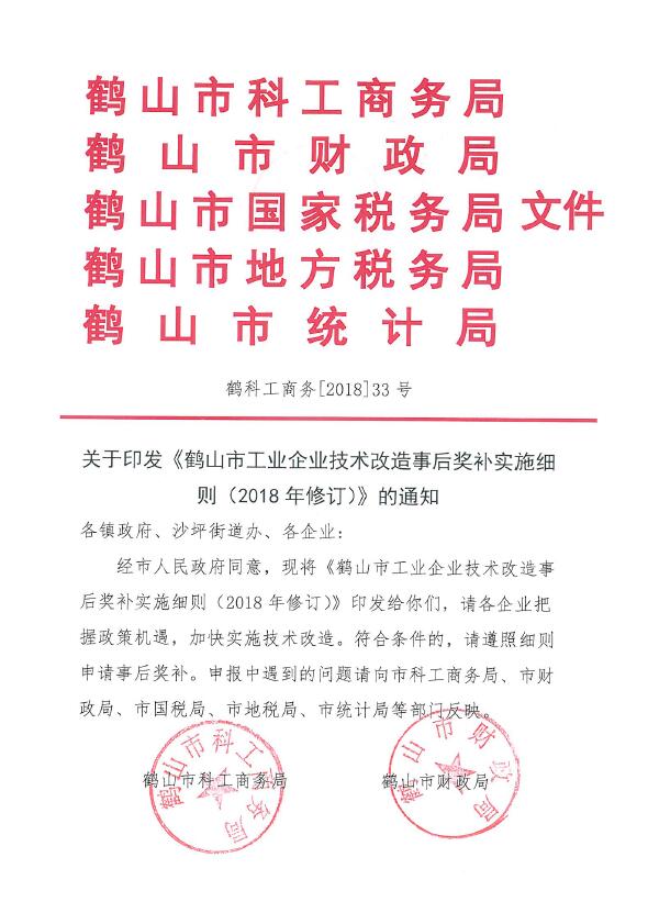 鹤科工商务[2018]33号 关于印发《西瓜视频 工业企业技术改造事后奖补实施细则(2018年修订》的通知
