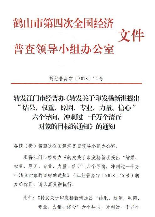 鹤经普办字〔2018〕14号关于转发江门市经普办《转发关于印发杨新洪提出“结果、权重、原因、专业、力量、信心”六个导向,冲刺过一千万个清查对象的目标的通知》的通知.pdf