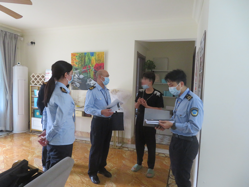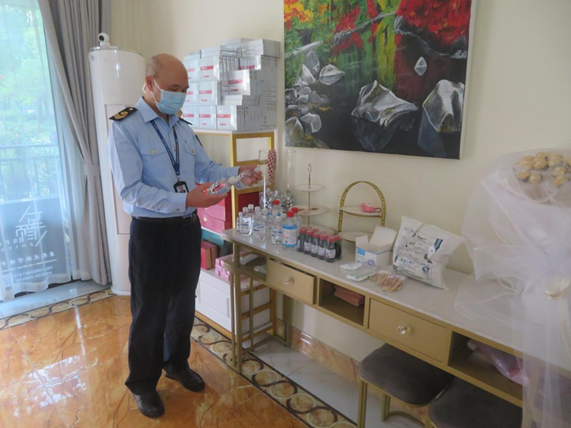 近日,市卫生监督所接群众投诉举报,有人在某住宅小区开展针剂注射的医疗美容服务,怀疑存在非法医美行为,我所立即派出执法人员到场开展检查。经核查,该地址为鹤山碧桂园天汇小区一居民住宅,大门口没有悬挂招牌,大门口正上方、右侧悬挂“祛斑、祛痰、祛黄、纹绣”的广告,正前方悬挂有“美白祛斑”“无痕双眼皮”“45°翘睫芭比眼”“媚眼术”等医疗美容广告,在该场所内查见稀洛因精华素、没有中文标识的美容产品、“嗨体”美容产品、已使用的针头一批和顾客登记本等物品。