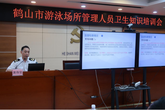 培训会上,市卫生监督所副所长冼明尊作主持讲话,强调游泳场所的特殊性和重要性,要求各游泳场所负责人要提高思想认识,强化卫生安全责任意识,抓实抓细游泳场所卫生管理措施,为群众提供优质卫生的游泳健身服务。随后,市卫生监督所稽查股执法人员结合日常监督中常见问题,详细解读了《公共场所卫生管理条例实施细则》和《公共场所设计卫生规范第3部分:人工游泳场所》等法律法规及卫生标准,并对我市近三年西瓜视频 游泳场所行政处罚案件情况、投诉举报重点问题进行了分析说明,通过“以案析法”方式警示教育游泳场所要落实卫生安全第一责任人的责任。最后,执法人员通过简单、形象的管理实例,与参会游泳场所管理人员探讨了游泳池水水质净化消毒管理的工作方法。