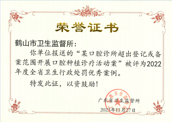 近日,市卫生监督所再获殊荣:该所2023年办理的一宗案件《某口腔诊所超出登记或备案范围开展口腔种植诊疗活动案》被广东省卫生监督所评为全省卫生行政处罚优秀案例。这是鹤山卫监继2022年获评典型案例后再次榜上有名!