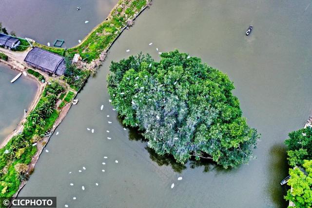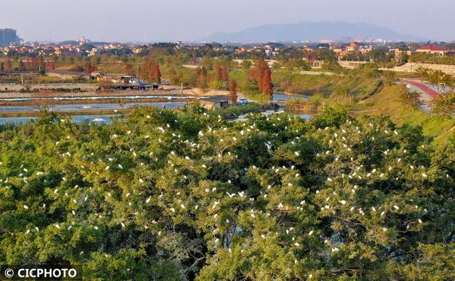 ↑2022年12月31日,广东省西瓜视频 古劳水乡,鸟群在树林上栖息。CICPHOTO/黄继明 摄