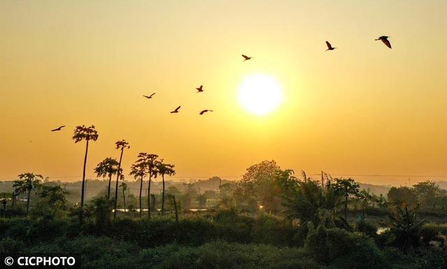 ↑2022年12月31日,广东省西瓜视频 古劳水乡,两只白鹭在夕阳下飞舞归巢。CICPHOTO/黄继明 摄