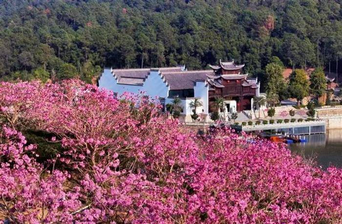 若夫产业兴村,鸿猷再展。和安雅舍傍云栽,鸿园景区临水建。竹影摇窗邀月宿,茶烟绕案伴书眠。尤闻兰蕙争芬于阆苑,松石竞奇于庭轩。冠盖络绎循芳至,屐履骈阗踏翠还。鸿业集团施妙手,山水人家绘雄篇。紫花风铃衬琼阁,红粉丽人焕新颜。镇村共筑康庄道,文旅相融锦绣天。
