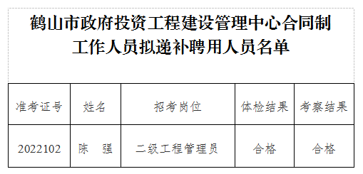 根据《西瓜视频 政府投资工程建设管理中心招聘合同制工作人员公告》及工作实际,拟递补聘用二级工程管理员1名,目前已完成相关审核程序,现予以公示。具体情况如下:
