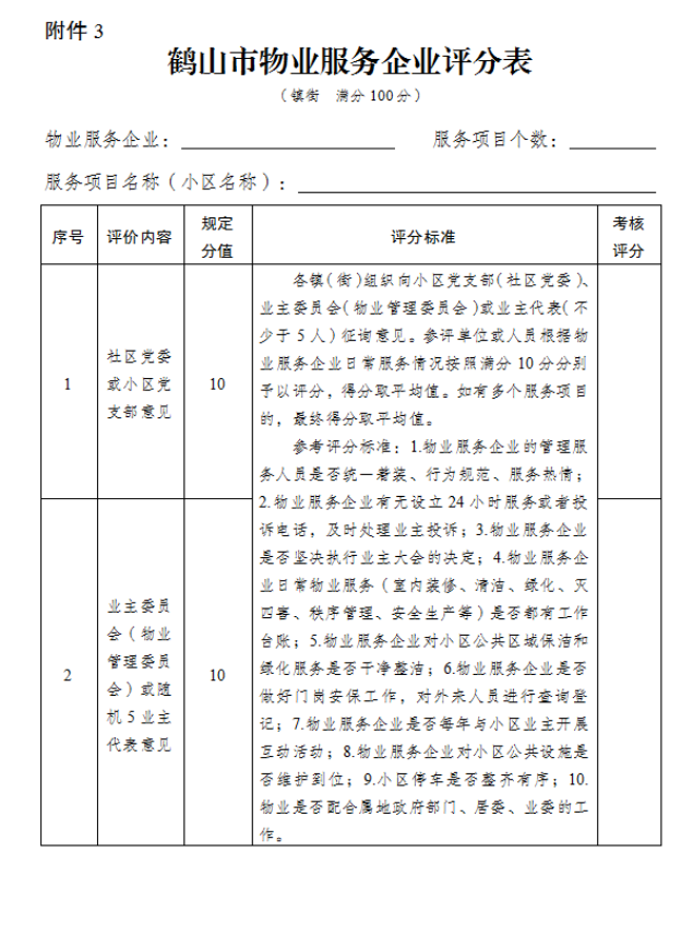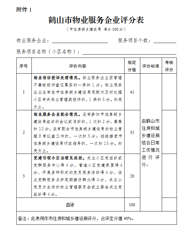 1.物业服务企业评分采用百分制,总分为100分,得分90分及以上的,评定为优秀;得分60分及以上且不足90分的,评定为良好;得分不足60分的,评定为不合格。评分活动中,市住房城乡建设局分值占比为40%,部门综合分值占比为30%,镇(街)分值占比为30%。具体评分细则详见附件。