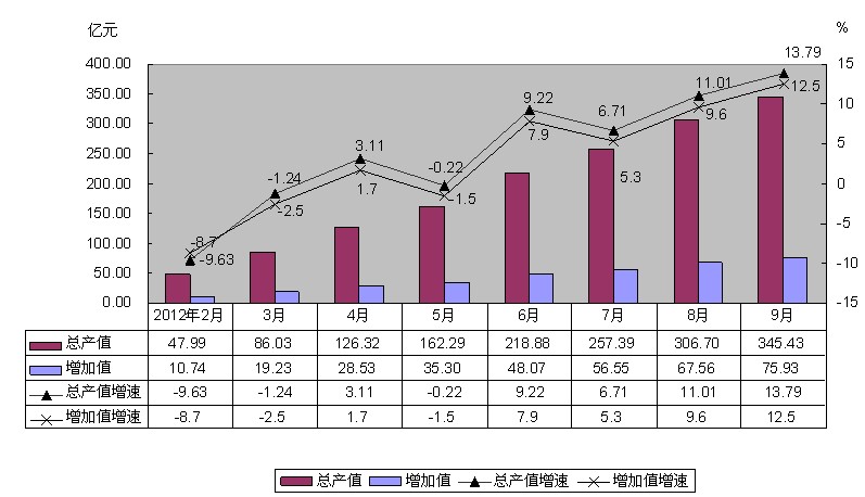 (一)工业生产逐步回暖,稳步增长。1-9月,完成规模以上工业总产值345.43亿元,同比增长13.79%;完成工业增加值75.93亿元,同比增长12.5%。9月总产值、增加值累计增幅为年度最高,分别比上半年上升4.57和4.6个百分点。(附图1)