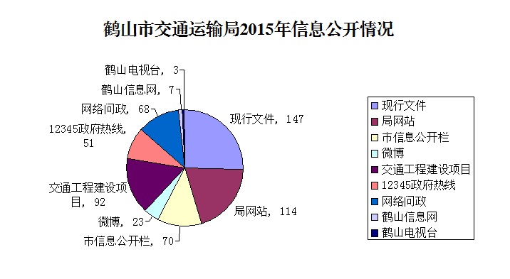 2015年,为进一步方便群众查询信息,我局通过各种渠道公开的信息共575条(件),其中:主动公开486条(件),依申请公开89件,主要包括:局网站114条、鹤山交通微博23条,交通工程建设项目信息92条,现行公开文件147件(其中依申请公开89件),12345政府热线51条、网络问政68条,鹤山信息网、鹤山电视台、宣传栏等10条。