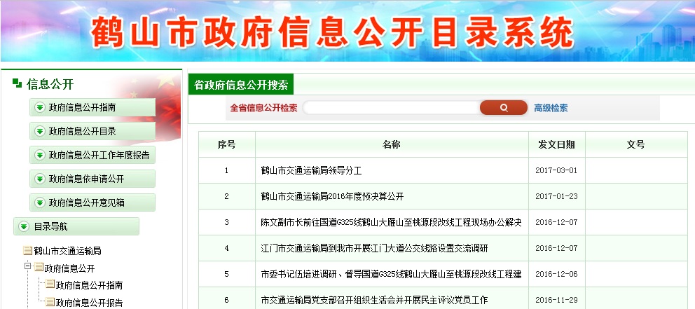 2016年,为进一步方便群众查询信息,我局通过各种渠道公开的信息共629条(件),其中:主动公开594条(件)主要包括:局网站224条、微博微信78条、交通工程建设项目信息96条,现行公开文件112件,12345政府热线33条、网络问政73条,鹤山信息网、鹤山电视台、宣传栏等13条。