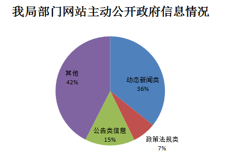2016年1月至12月,我局部门网站发布信息400条,其中动态新闻类信息143条,约占35.8%;政策法规类信息28条,约占7%;公告类信息59条,约占14.8%。