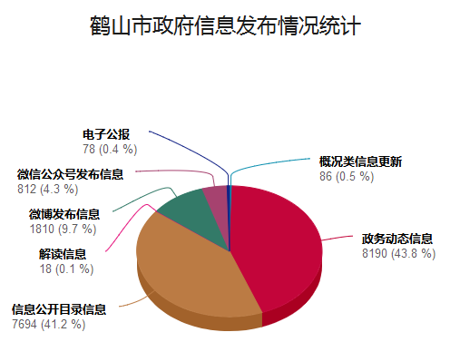 2019年,西瓜视频 信息发布14163条,其中,概况类信息更新86条,政务动态信息更新8190条,信息公开目录信息更新7694条。解读信息发布18条。通过“中国侨都-鹤山发布”新浪微博发布信息1810条,粉丝数达60931人;“鹤山政府网”微信公众号发布信息812条,粉丝数达112954人,做到及时公开市政府全体会议和常务会议讨论决定等事项。