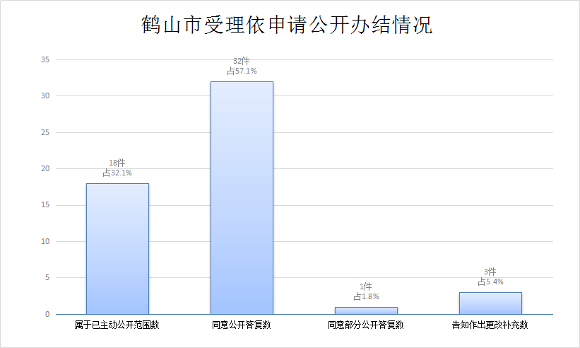 申请受理总数56件中,所有申请均按时办结并按要求答复群众。其中,属于已主动公开范围数18件,占32.1%;同意公开答复数32件,占57.1%;同意部分公开答复数 1件,占1.8%;告知作出更改补充数3件,占5.4%。