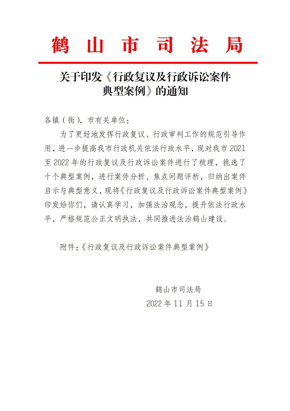 2022年,市司法局坚持以标本兼治和以案促改为导向,多措并举建立健全行政复议倒逼依法行政及推进法治政府建设的监督机制,其中近期集中发布了10个典型行政案例,汇编为《行政复议及行政诉讼案件典型案例》(以下简称《典型案例》),印发给全市各镇(街)及其它有关单位,推动行政执法人员转变执法理念、创新执法方式、规范执法程序、提高执法水平,纵深推进鹤山法治政府建设。