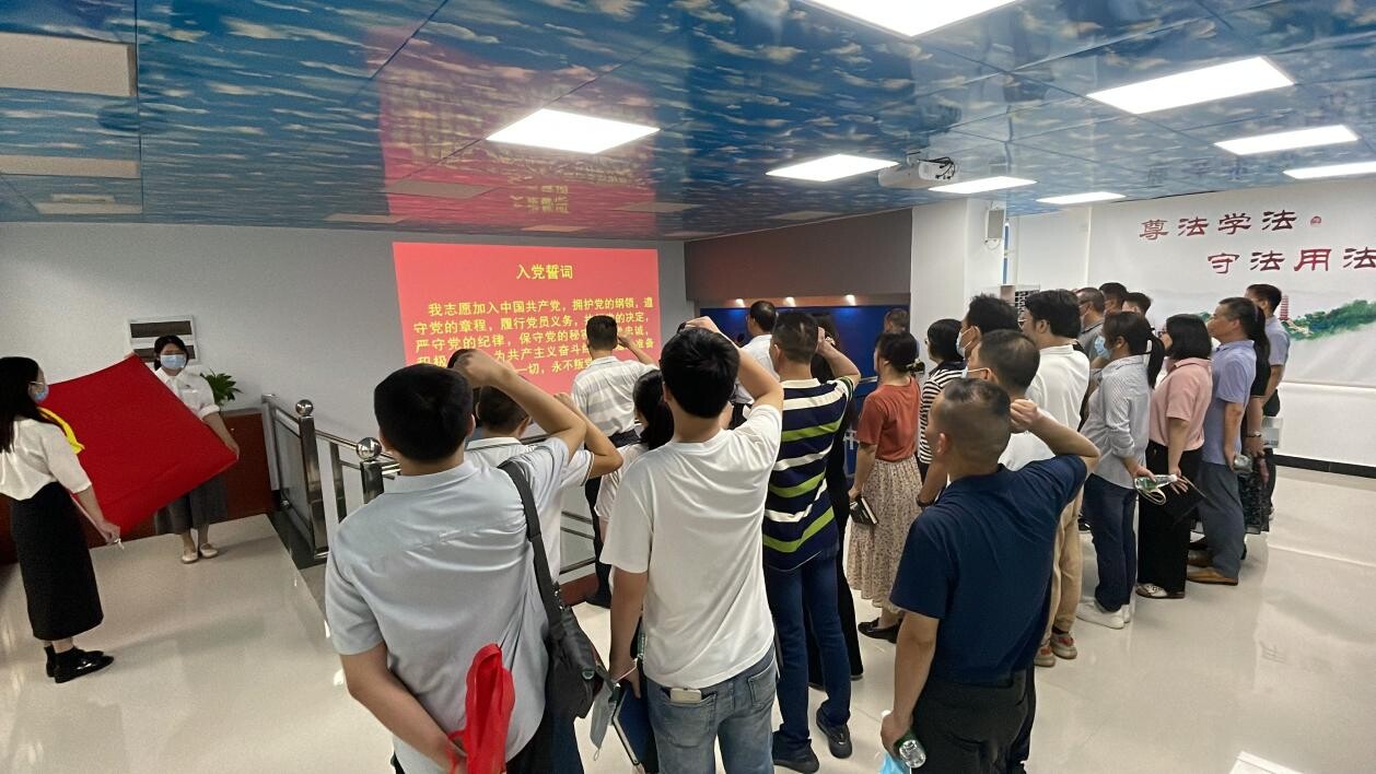 在市司法局的青少年智慧法治教育实践基地,西瓜视频 委统战部副部长、侨务局局长李汉文、侨联专职副主席麦美菊,市司法局党组书记、局长冯杰晖,市资产经营有限公司党支部书记、董事长、总经理杨少云带领各单位党员面向党旗举起右手庄严肃立,铿锵有力地重温入党誓词,重忆入党初心,重新接受党性洗礼。