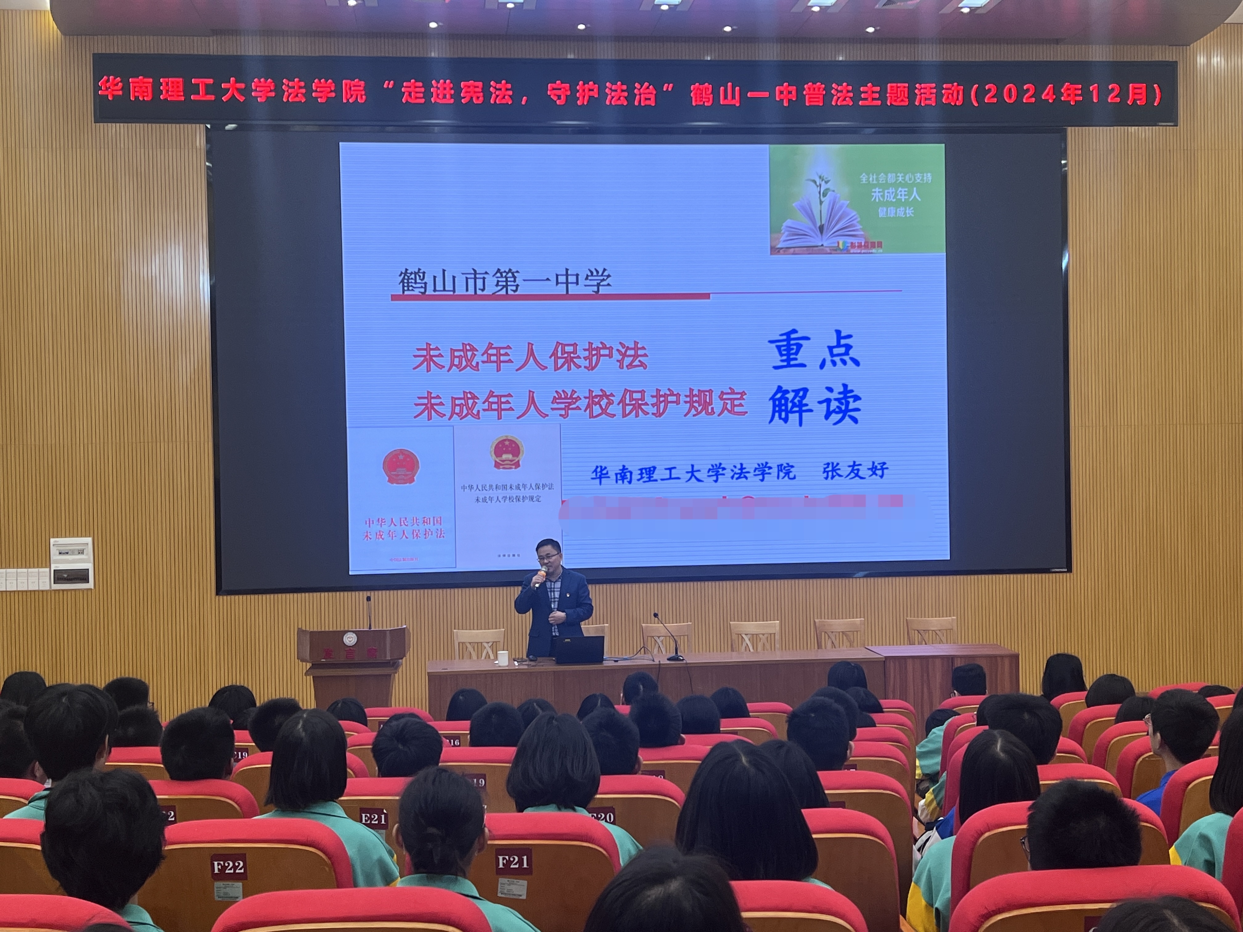 12月4日,华南理工大学法学院、西瓜视频 司法局、西瓜视频 教育局、西瓜视频 法学会在西瓜视频 第一中学联合举办以“走进宪法,守护法治”为主题的普法宣传教育活动。活动期间,华南理工大学法学院副院长张友好为鹤山一中师生带来了一场精彩生动的宪法知识讲座。通过深入浅出的讲解、鲜活真实的案例分析,让学生们深刻领悟到宪法在日常生活中的重要地位与深远意义。张友好副院长还围绕《中华人民共和国未成年人保护法》的核心内容,讲解了家庭、学校、社会在未成年人保护中的责任与义务。鹤山一中的学生们纷纷表示,此次宪法日活动形式新颖、内容充实,让原本抽象的宪法知识变得通俗易懂。