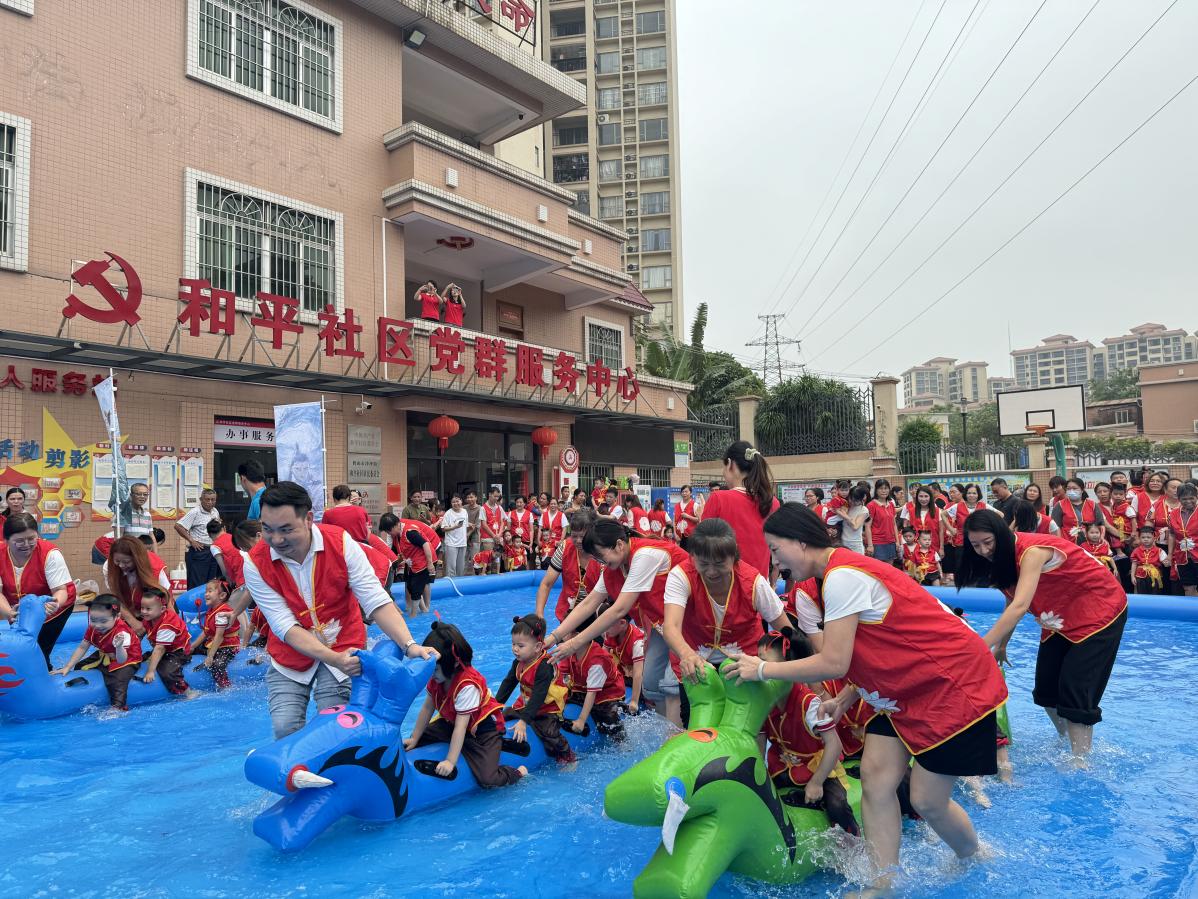 “妖怪!哪里逃。”“我最先找到宝藏。”“加油!”……近日,在和平社区党群服务中心门前广场热闹非凡,众多亲子家庭共同挑战精彩的水上游戏项目,“哪吒勇闯龙宫”“水枪大战海妖”“寻宝大作战”等项目让孩子们在水中尽情释放活力,欢笑声、加油声此起彼伏。