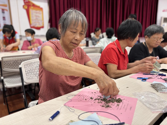 桂林社区居民群众在“清明融于情,红色润于心”清明节主题活动上缝制香囊