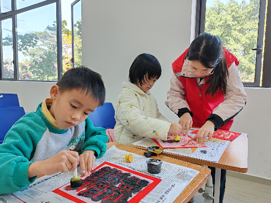 1月20日,凤凰社区组织公益寒托班的小朋友们开展“拓印添年味,墨香迎新春”拓印福字活动