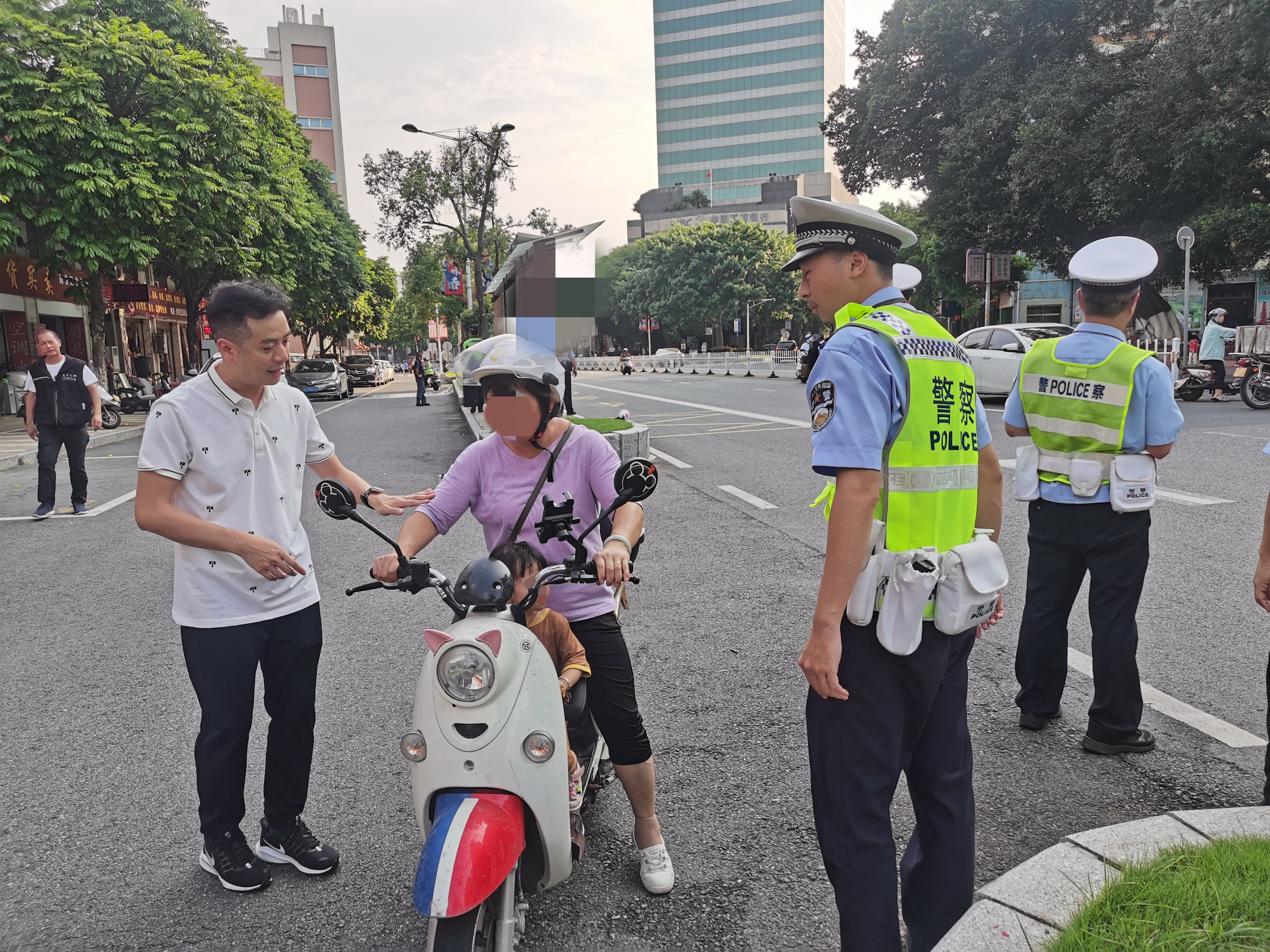劝导纠正驾驶、搭乘电动自行车的大人、小孩都要佩戴头盔,小孩要用安全带与大人固定好