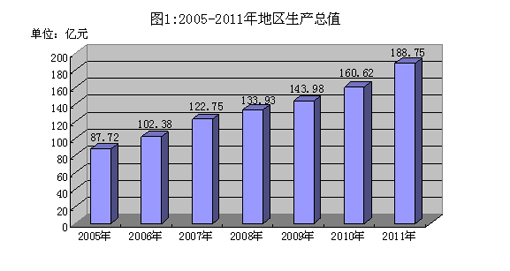 初步核算,2011年全市地区生产总值188.75亿元,增长12.0%。分产业看,第一产业增加值16.23亿元,增长3.8%;第二产业增加值106.99亿元,增长14.5%;第三产业增加值65.53亿元,增长9.9%。三大产业的比例是8.6:56.7:34.7。人均地区生产总值37991元,增长12.9%。全社会用电量为23.97亿千瓦时,增长9.3%,其中城镇居民用电11490万千瓦时,增长14.5%,农村居民用电11092万千瓦时,增长16.3%。