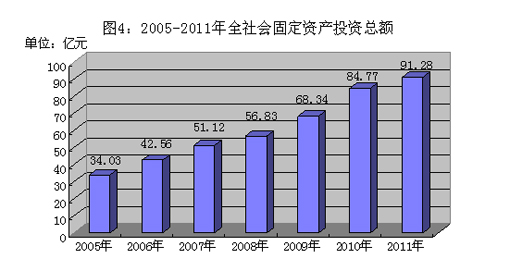 2011年全社会固定资产投资91.28亿元,增长12.0%。按投资结构分,基础设施投资15.55亿元,下降42.5%;其他投资44.39亿元,增长48.7%;房地产投资31.34亿元,增长27.5%。按产业分,第一产业投资1.23亿元,下降13.7%;第二产业投资41.12亿元,增长38.6%;第三产业投资48.93亿元,下降2.9%。