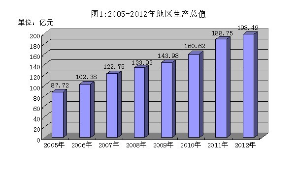 初步核算,2012年全市地区生产总值198.49亿元,增长8.3%。分产业看,第一产业增加值15.77亿元,增长4.3%;第二产业增加值111.66亿元,增长13.3%;第三产业增加值71.06亿元,增长1.8%。三大产业的比例是7.9:56.3:35.8。人均地区生产总值39889元,增长4.8%。全社会用电量为25.65亿千瓦时,增长7.0%,其中城镇居民用电12689万千瓦时,增长10.4%,农村居民用电12237万千瓦时,增长10.3%。