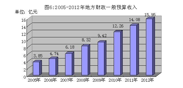 2012年全市地方财政一般预算收入15.95亿元,增长13.3%。其中:增值税增长10.6%,营业税下降0.8%,企业所得税增长22.6%,个人所得税下降12.0%。全市镇(街)财政收入9.50亿元,增长17.7%,占全市财政一般预算收入的比重为59.6%。全部镇(街)财政收入超千万元,8个镇(街)增幅超过15%。共和镇财政收入10202万元,古劳镇财政收入10197万元,继沙坪、雅瑶后鹤山又增添两个财政收入超亿元的镇。国税收入20.30亿元,增长16.3%,地税收入14.53亿元,增长8.3%。