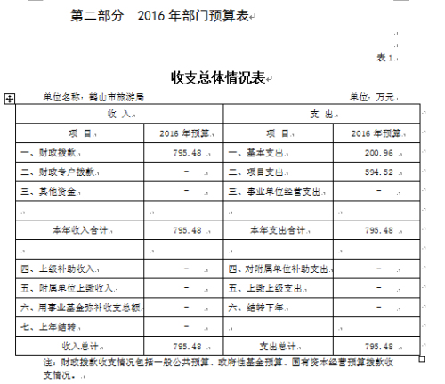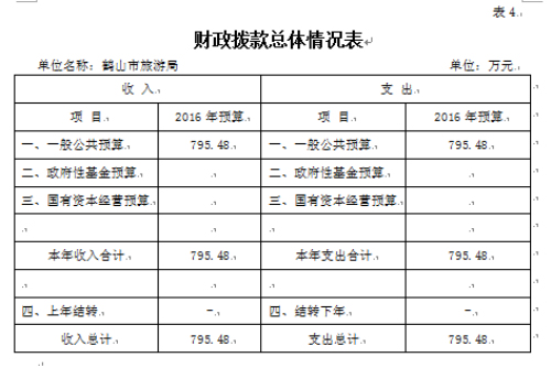 按照综合预算的原则,旅游局所有收入和支出均纳入部门预算管理。收入包括:一般公共预算拨款收入、政府性基金预算拨款收入、专款专用资金收入、事业收入、事业单位经营收入、其他收入、上级补助收入、附属单位上缴收入、用事业基金弥补收支差额、上年结转结余;支出包括:一般公共服务支出、国防支出、公共安全支出、教育支出、科学技术支出、文化体育与传媒支出等。旅游局收支总预算795.48万元。