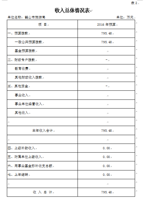 旅游局2016年收入预算795.48万元,其中:一般公共预算拨款收入795.48万元,占100%。
