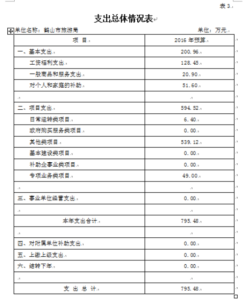 旅游局2016年财政拨款收支总预算795.48万元。收入包括:一般公共预算拨款本年收入772.48万元,上年结转23万元。支出包括:社会保障和就业(类)支出35.60万元、医疗卫生与计划生育(类)支出8.04万元、商业服务业等(类)支出737.63万元、住房保障(类)支出14.21万元。