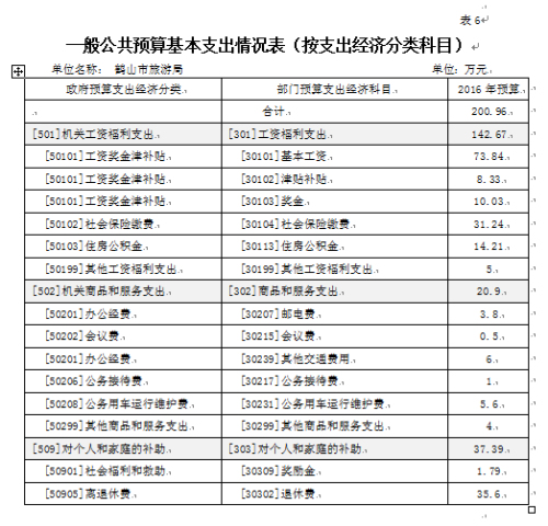 旅游局2016年一般公共预算基本支出200.96万元,其中:人员经费189.86万元,主要包括:基本工资、津贴补贴、奖金、社会保障缴费、绩效工资、对个人和家庭补助支出;公用经费11.1万元,主要包括:办公费、公车运行维护费、公务接待费、会议费。