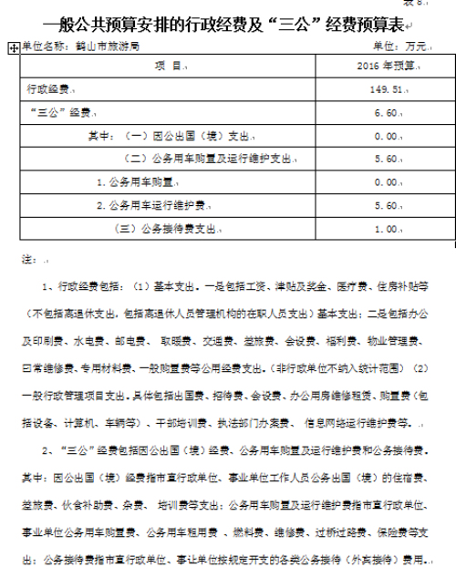 4.“三公”经费:是指财政部门用财政拨款安排的因公出国(境)费、公务用车购置及运行费和公务接待费。其中,因公出国(境)费反映单位公务出国(境)的国际旅费、国外城市间交通费、住宿费、伙食费、培训费、公杂费等支出;公务用车购置及运行费反映单位公务用车车辆购置支出(含车辆购置税)及租用费、燃料费、维修费、过路过桥费、保险费、安全奖励费用等支出;公务接待费反映单位按规定开支的各类公务接待(含外宾接待)支出。