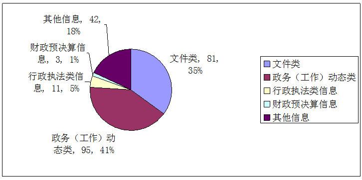 2016年,我局主动公开政府信息455条,其中市卫生计生局门户网站223条,在“中国.鹤山”门户网站232条,其中文件类信息81条,占35%,政务(工作)动态类信息95条,占41%,行政执法类信息11条,占5%,财政预决算信息3条,占1%,其他信息42条,占18%(见图2)。通过政务微博公开信息159条;通过微信公众号公开信息132条。