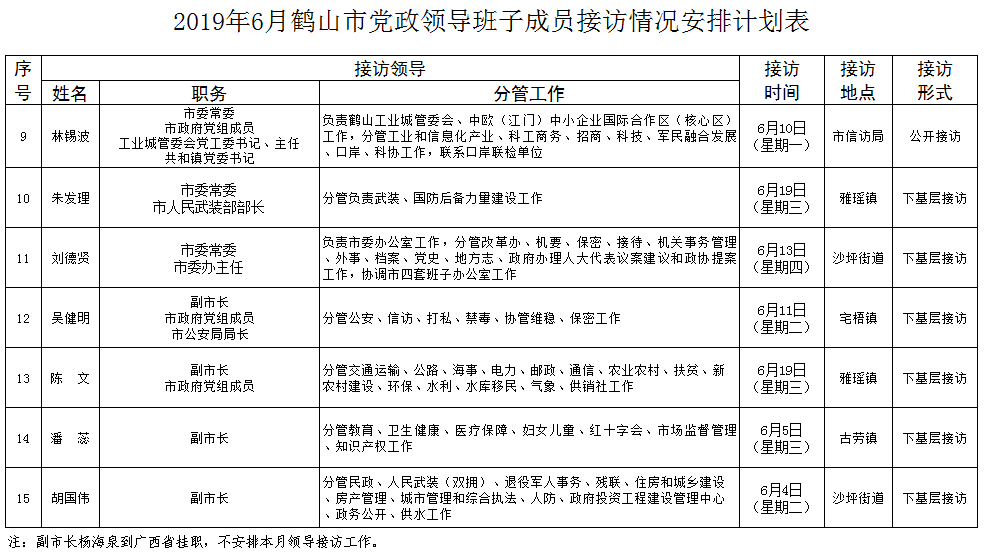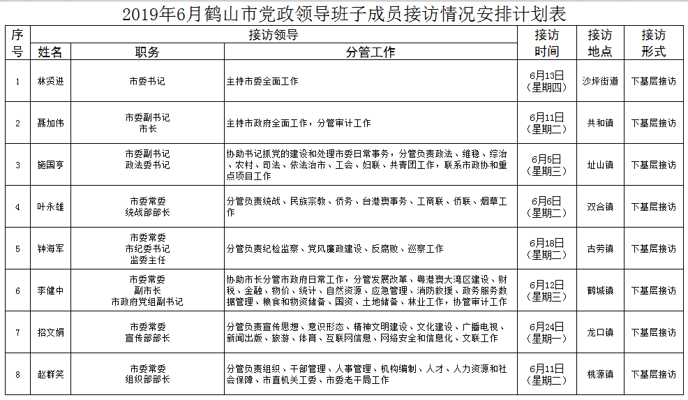 2019年6月西瓜视频 党政领导班子成员接访情况安排计划表