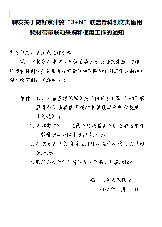 转发关于做好京津冀“3+N”联盟骨科创伤类医用耗材带量联动采购和使用工作的通知
