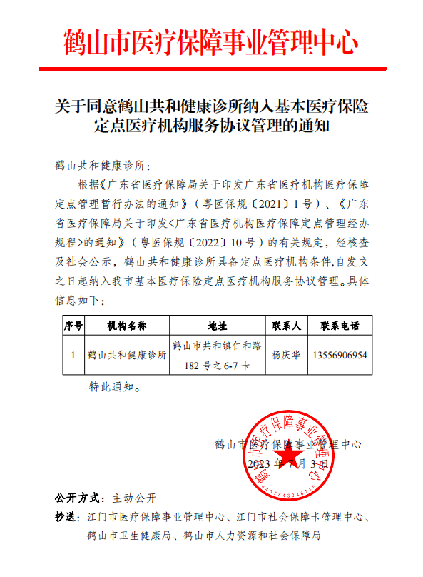关于同意鹤山共和健康诊所纳入基本医疗保险 定点医疗机构服务协议管理的通知