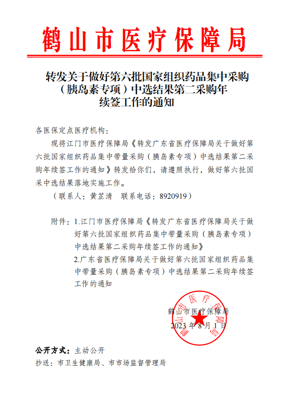 附件1:转发广东省医疗保障局关于做好第六批国家组织药品集中带量采购(胰岛素专项)中选结果第二采购年续签工作的通知.pdf