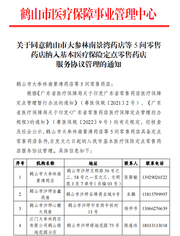 关于同意西瓜视频 大参林南景湾药店等5间零售药店纳入基本医疗保险定点零售药店服务协议管理的通知