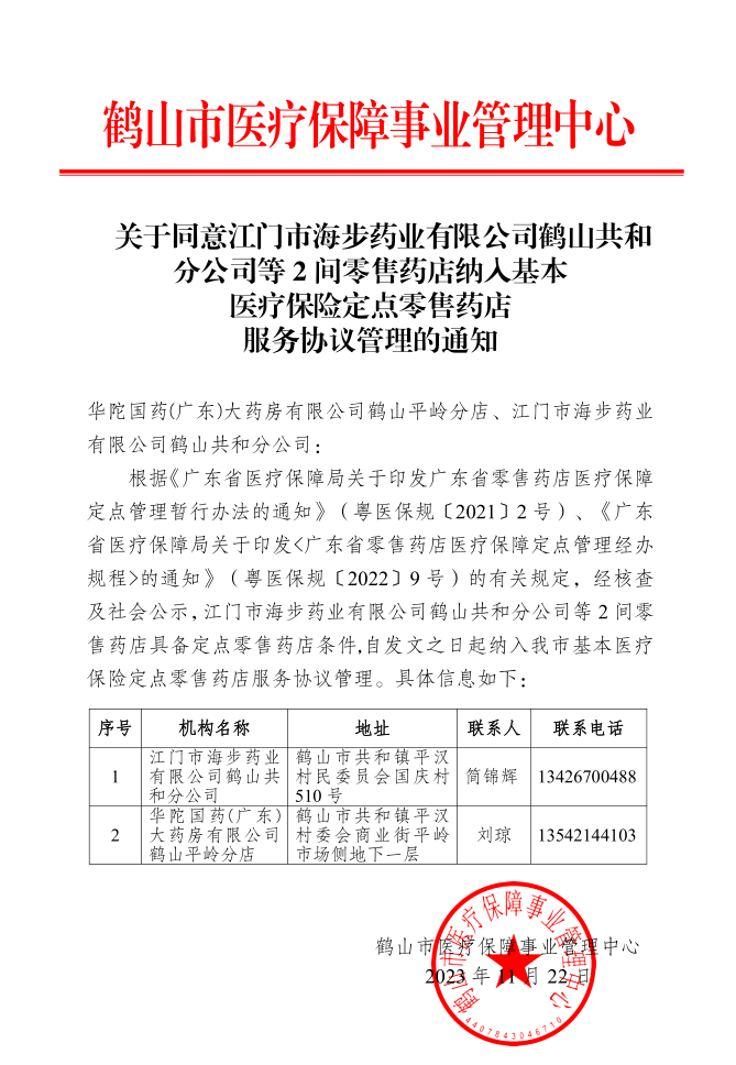 关于同意江门市海步药业有限公司鹤山共和分公司等2间零售药店纳人基本医疗保险定点零售药店服务协议管理的通知