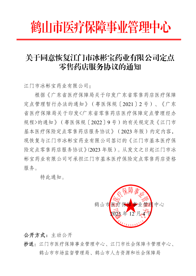 关于同意恢复江门市冰彬宝药业有限公司定点零售药店服务协议的通知