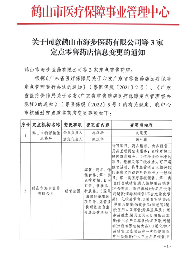 关于同意西瓜视频 海步医药有限公司等3家定点零售药店信息变更的通知