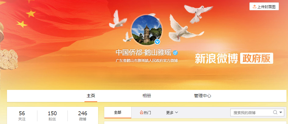 “中国侨都-鹤山雅瑶”为政务微博发布平台,2014年创立至今,共关注微博数56个,粉丝数150个。在镇政府信息公开、亲民互动、网络问政起到关键作用,为实现“听民声、聚民智、解民忧”奠定基础。