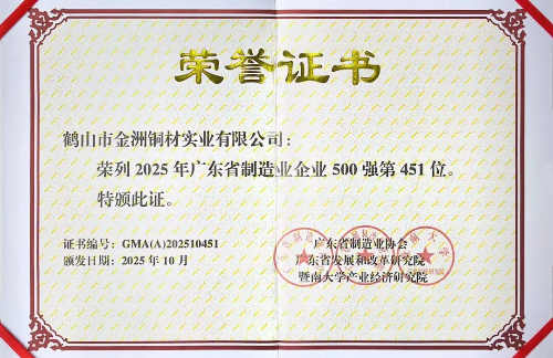 金洲铜材实业有限公司(以下简称“金洲铜业”)位于址山镇东溪工业开发区,成立于2005年,是国家高新技术企业、广东省专精特新中小企业,也是华南地区知名的铜材制造商。公司专注于铜锭、铜棒等铜锻造系列产品的研发、生产与销售,产品线涵盖重力铸造铜锭、无铅铜棒、硬模铜锭等,广泛应用于水暖卫浴、工艺制品、灯饰、锁业及阀门等领域。 金洲铜业始终将技术创新视为核心竞争力,新建研发中心,专注于铜材的研发与品质提升,重点开发满足客户需求的高品质材料,尤其是符合欧洲、澳洲标准的高端产品。近年来,金洲铜业销售额持续攀升,2024年突破4亿元,同比增长8.11%,市场竞争力持续增强。