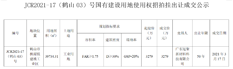 JCR2021-17(鹤山03)号国有建设用地使用权招拍挂出让成交公示
