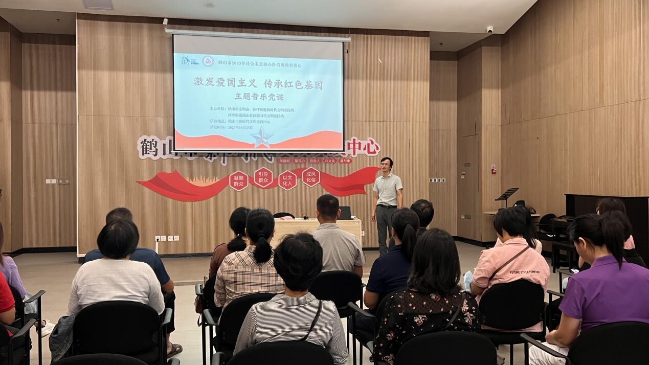 新时代文明实践中心唱响,“音乐党课”志愿服务宣讲队代表黎力华老师带领大家跟着旋律重温党史,在歌声中感受初心。