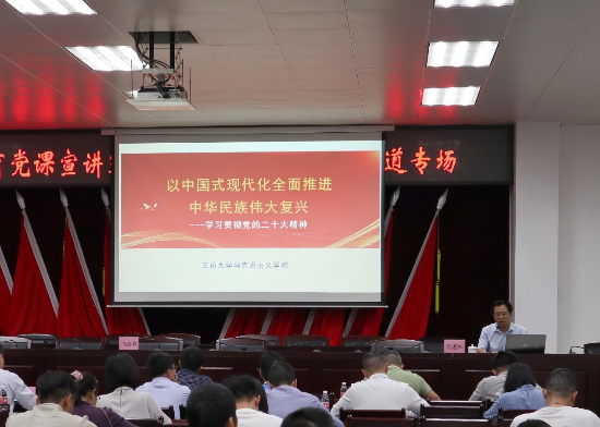 本次党课邀请了五邑大学马克思主义学院院长、江门市委主题教育宣讲团成员何进军授课。何进军以“以中国式现代化全面推进中华民族伟大复兴——深入学习贯彻党的二十大精神”为主题,围绕党的二十大精神,深入阐述了坚定拥护“两个确立”、坚决做到“两个维护”的重要意义和必要性以及中国式现代化的科学内涵和实践要求。讲课内涵丰富,重点突出,既有政治理论高度,又对听课的党员干部准确理解和全面把握党的创新理论具有指导和推动作用。