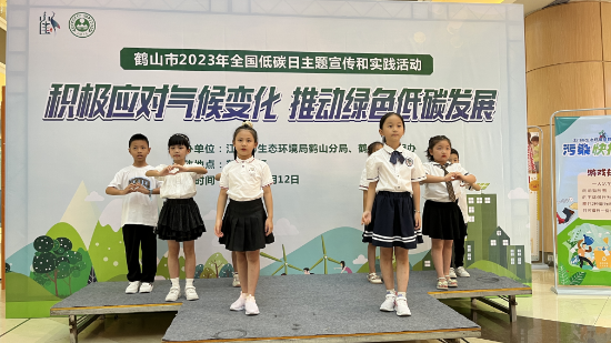 由江门市生态环境局鹤山分局组建的“环保青少年讲团”在活动现场,以一词《双碳环保》道出绿色低碳生活的真谛,把绿色、低碳、节约、适度的生活理念普及各个家庭,让生态文明的种子在孩子的心中悄然生根发芽。