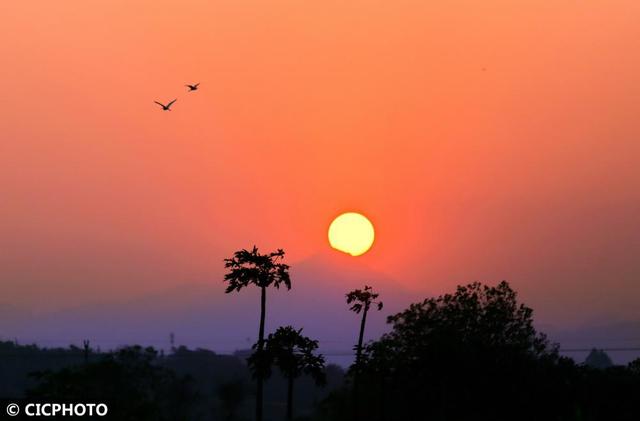 ↑2022年12月31日,广东省西瓜视频 古劳水乡,两只白鹭在夕阳下飞舞归巢。CICPHOTO/黄继明 摄